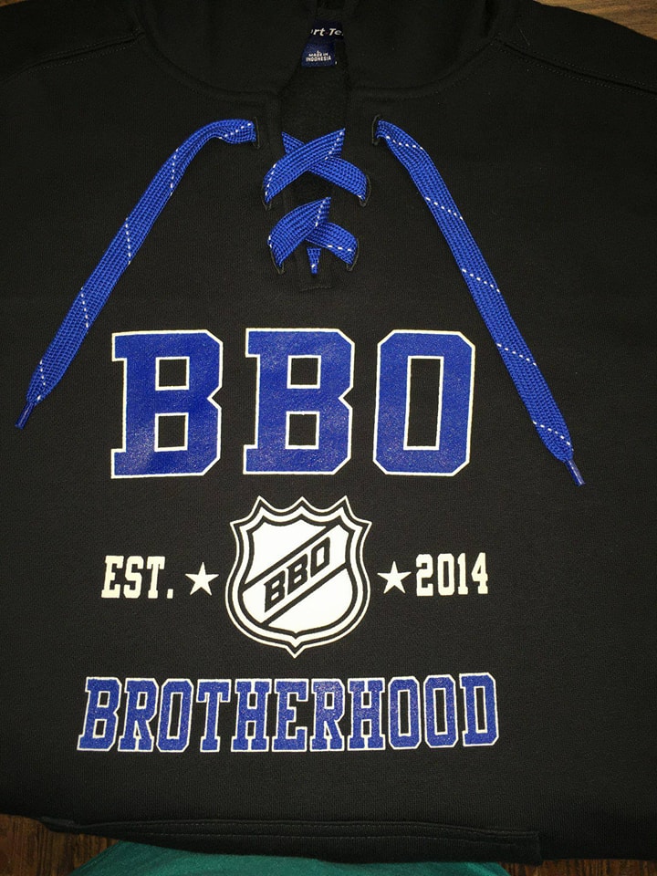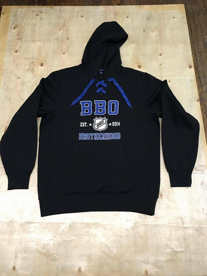 The official BBO Brotherhood Hoodie. A special limited edition design screenprinted with large BBO blue lettering with a white outline across the top, our BBO shield logo with the words Est. 2014 across the middle and the word “Brotherhood” across the bottom to complete the design.