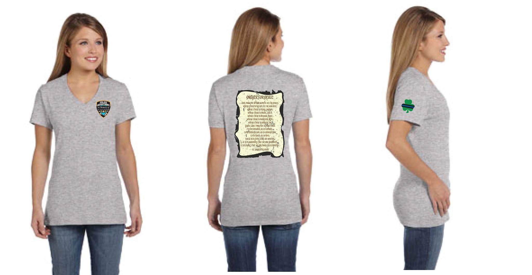 The Brothers Before Others Ladies Detective Steven McDonald Memorial Shirt. On the front left chest area is a NYC patch with a black mourning “band” with the words, “In Memory of Det. Steven McDonald.”  On the right sleeve, is a green shamrock with a thin blue line morning band through it.